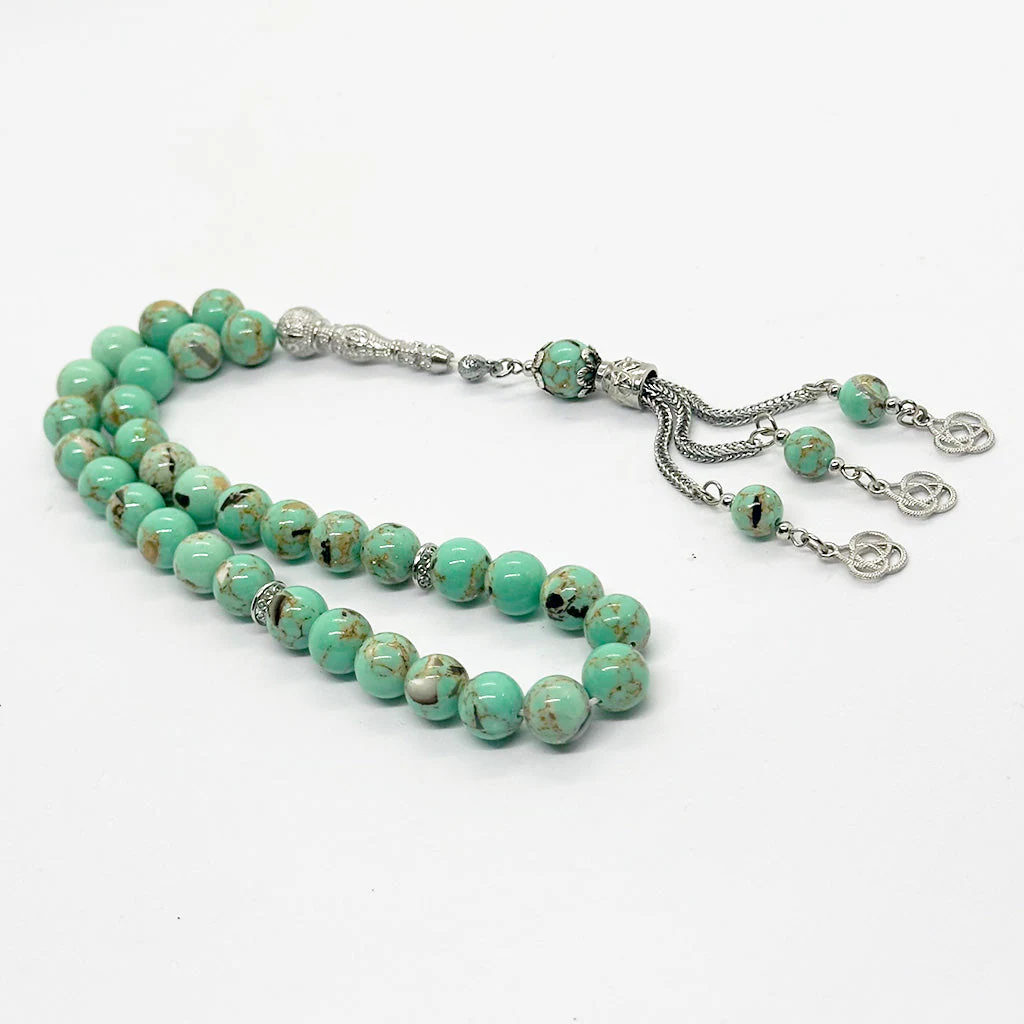 سبحة مصنوعة من حجر توسانا الطبيعي، مكوّنة من 33 حبّة بمقاس 10 مم. مناسبة للاستخدام اليومي في الذكر، مع تدرجات لونية طبيعية وملمس متوازن في اليد.
